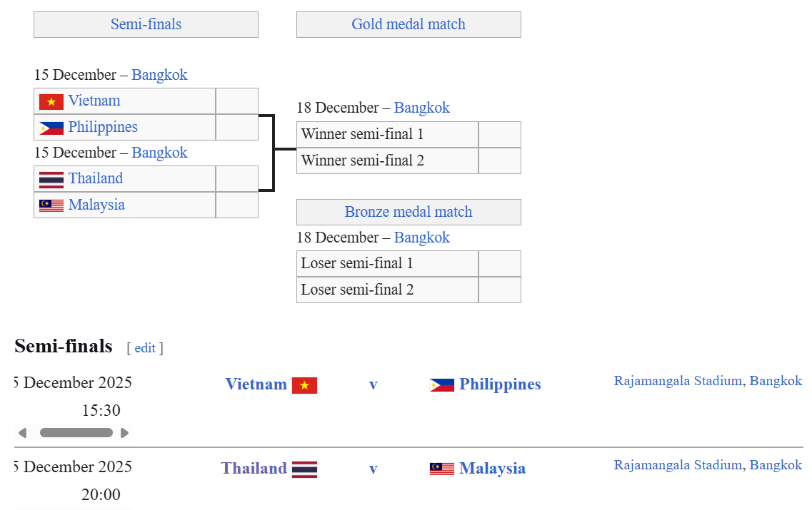 Theo lịch thi đấu bán kết môn bóng đá nam SEA Games 33, U22 Việt Nam sẽ chạm trán U22 Philippines vào lúc 15 giờ 30 phút, còn U22 Thái Lan gặp U22 Malaysia vào lúc 20 giờ. Cả hai trận đấu đều diễn ra ngày 15-12.