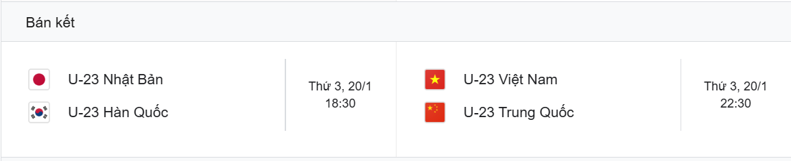 Theo lịch thi đấu bán kết Giải bóng đá U23 châu Á 2026 mới nhất, U23 Việt Nam “chạm trán” U23 Trung Quốc vào lúc 22 giờ 30 phút ngày 20-1. Trước đó vào lúc 18 giờ 30 phút ngày 20-1 là cuộc đối đầu giữa U23 Nhật Bản và U23 Hàn Quốc. Cả hai trận đấu này đều được trực tiếp trên các kênh sóng của VTV, ứng dụng TV360 và được Báo Quân đội nhân dân cập nhật kết quả.