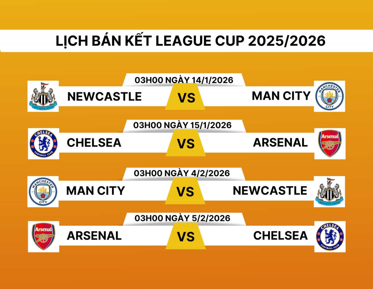 Theo lịch thi đấu và trực tiếp bán kết League Cup 2025/2026, Arsenal sẽ đối đầu với Chelsea. Trong khi đó, Man City gặp Newcastle. Các đội sẽ đá hai trận lượt đi và về sau đó xác định ra ai đội bóng xuất sắc nhất giành vé vào chung kết.