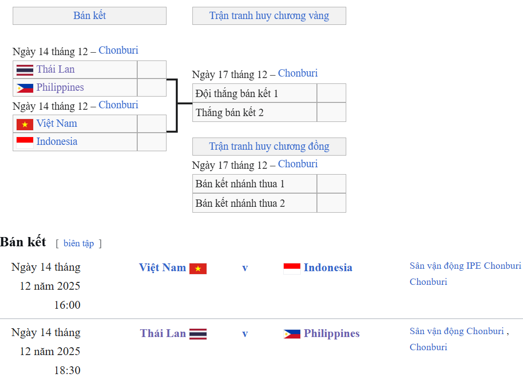 Theo lịch thi đấu, vòng bán kết môn bóng đá nữ SEA Games 33 diễn ra trong ngày 14-12. Cụ thể, đội tuyển bóng đá nữ Việt Nam gặp Indonesia vào lúc 16 giờ, còn trận bán kết còn lại diễn ra lúc 18 giờ 30 phút giữa Thái Lan và Philippines.