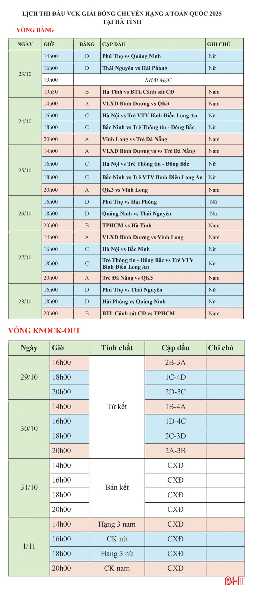 Theo lịch thi đấu bóng chuyền, Hà Tĩnh sẽ gặp Bộ Tư lệnh Cảnh sát cơ động vào lúc 20h ngày 23/10 (ngay sau lễ khai mạc) và gặp TP Hồ Chí Minh vào lúc 20h ngày 26/10.