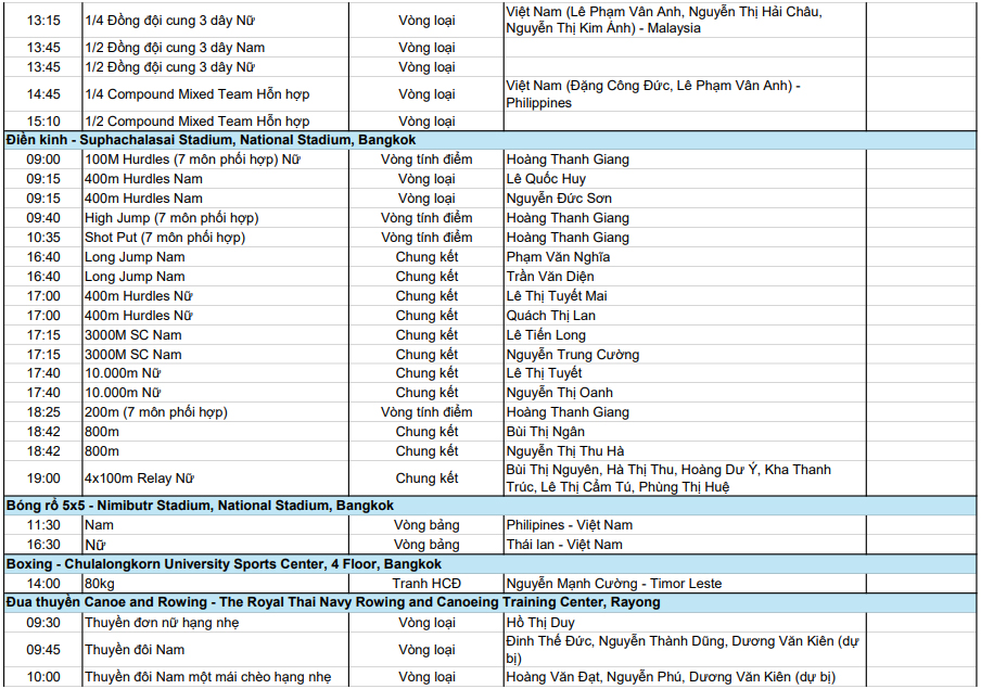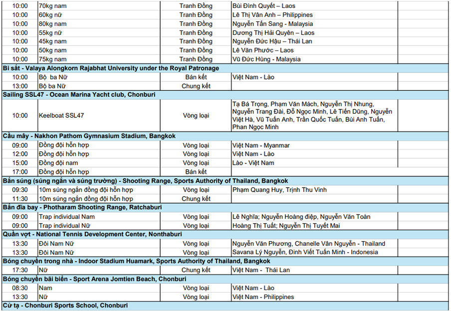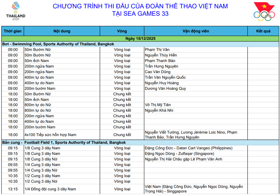 Dưới đây là lịch thi đấu SEA Games 33 của Đoàn thể thao Việt Nam trong ngày 15-12:
