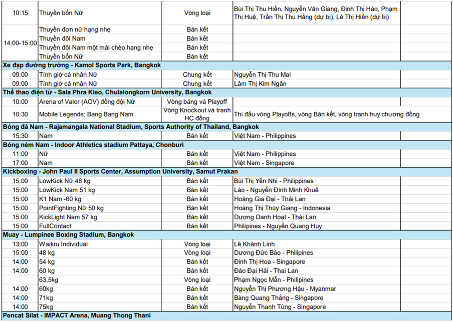 Trước đó, vào lúc 15 giờ 30 phút, trên sân Rajamangala (Bangkok) sẽ diễn ra trận bán kết môn bóng đá nam SEA Games 33 giữa U22 Việt Nam và U22 Philippines.