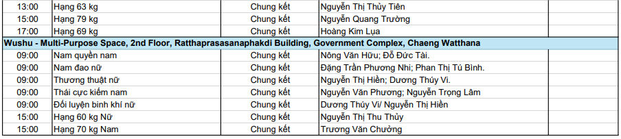 Bên cạnh đó, cử tạ, wushu cũng là những môn thể thao có nhiều nội dung đấu chung kết hứa hẹn hấp dẫn trong ngày thi đấu 15-12.