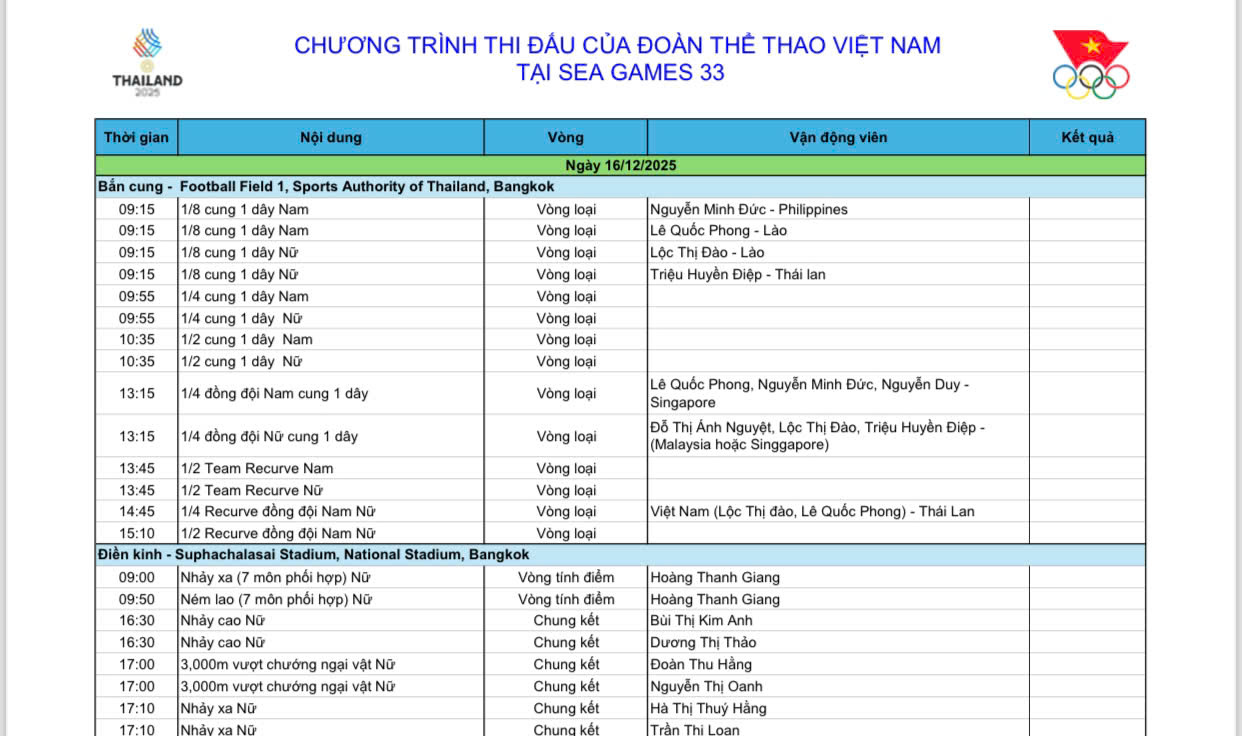 Dưới đây là lịch thi đấu SEA Games 33 của Đoàn thể thao Việt Nam trong ngày 16-12: