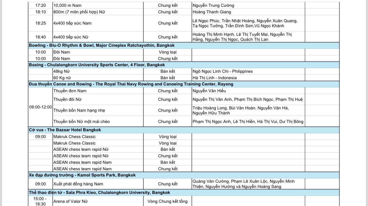 Hôm nay (16-12), Đoàn thể thao Việt Nam hứa hẹn sẽ đoạt nhiều huy chương khi nhiều môn bước vào chung kết như: Điền kinh, Bowling, đua thuyền, thể dục dụng cụ, kickboxing...