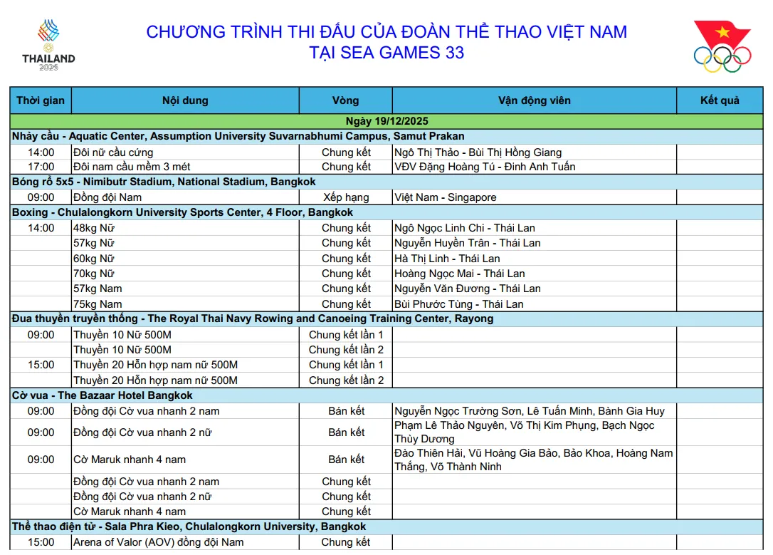 Trong ngày 19/12, một số môn thế mạnh của Đoàn Thể thao Việt Nam sẽ thi các nội dung chung kết như vật, boxing, đấu kiếm hay cờ. Trong đó, môn boxing với 6 nội dung chung kết tranh HCV sẽ là niềm hy vọng vàng lớn nhất.