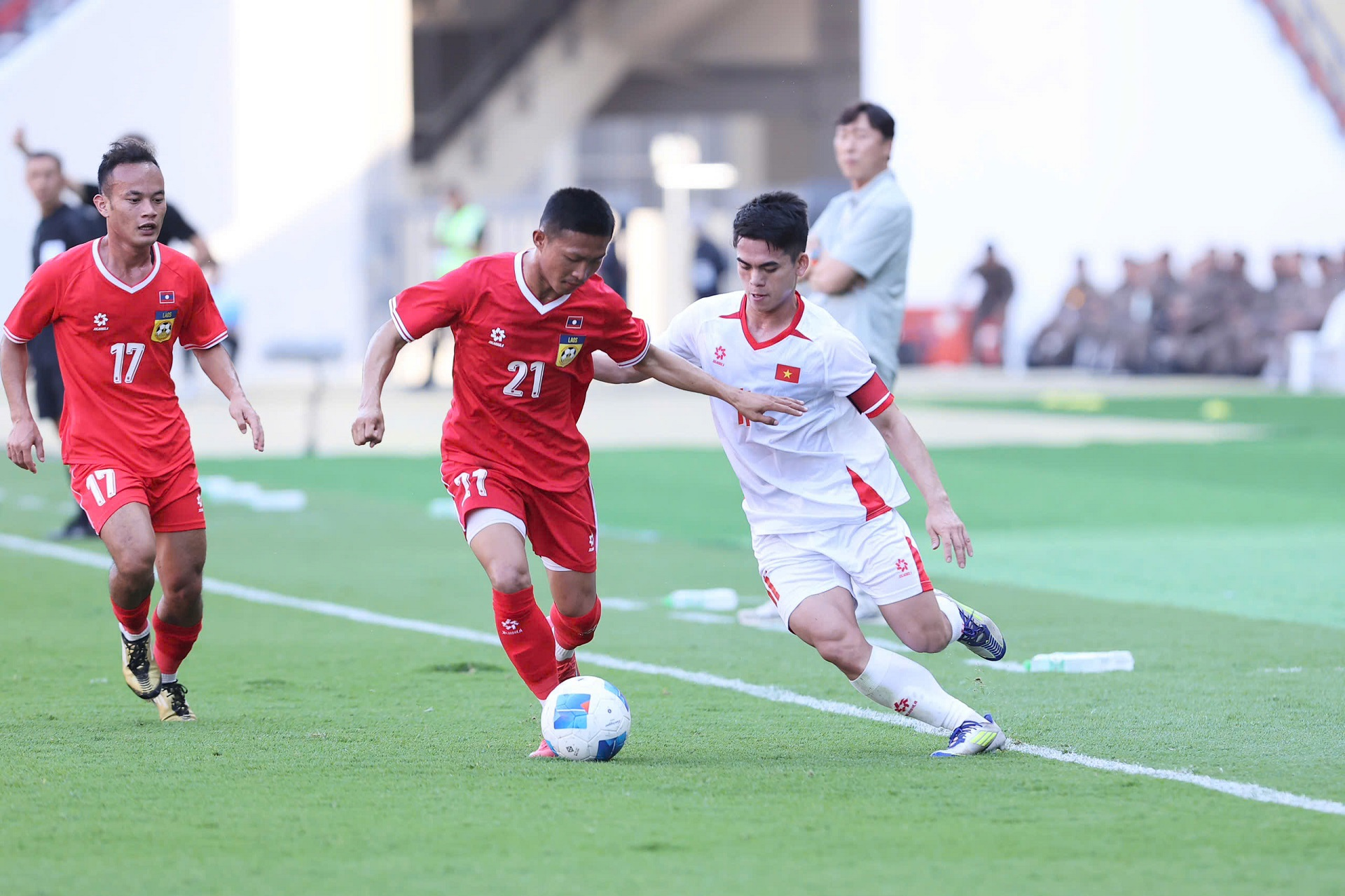 Đội tuyển Lào (áo đỏ) nhận thất bại 1-2 trước tuyển Việt Nam ở trận mở màn SEA Games 33.