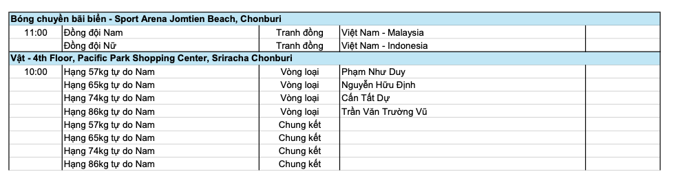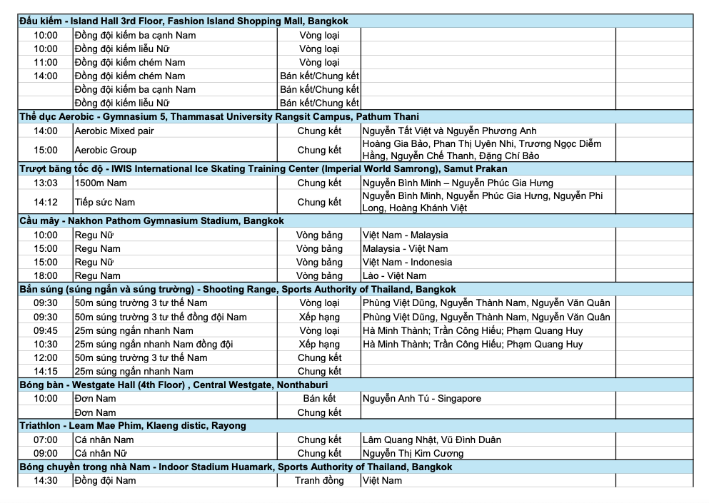 Ngoài ra, các môn đua thuyền truyền thống, đấu kiếm, cờ cũng có những nội dung chung kết quan trọng, góp phần mở rộng cơ hội huy chương cho đoàn Việt Nam.