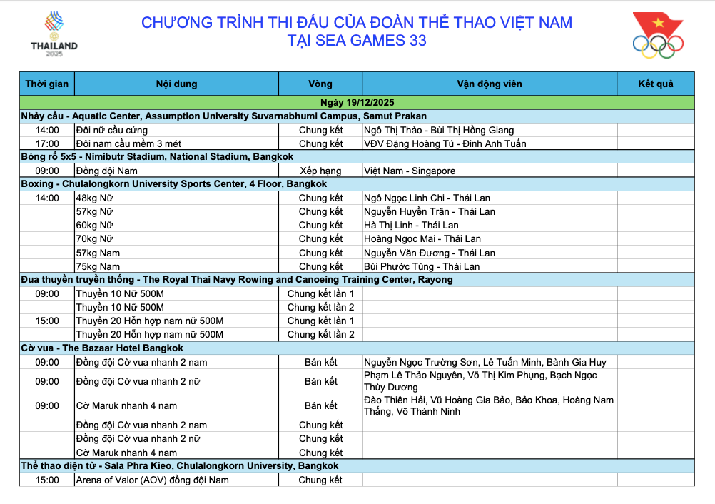 Sau ngày 18/12, Đoàn Thể thao Việt Nam đang sở hữu 73 HCV, 72 HCB và 99 HCĐ, vững vàng ở vị trí thứ 3 toàn đoàn. Ngày 19/12 được xem là “ngày vàng” để các VĐV Việt Nam gia tăng thành tích, khi nhiều nội dung chung kết diễn ra đồng loạt.