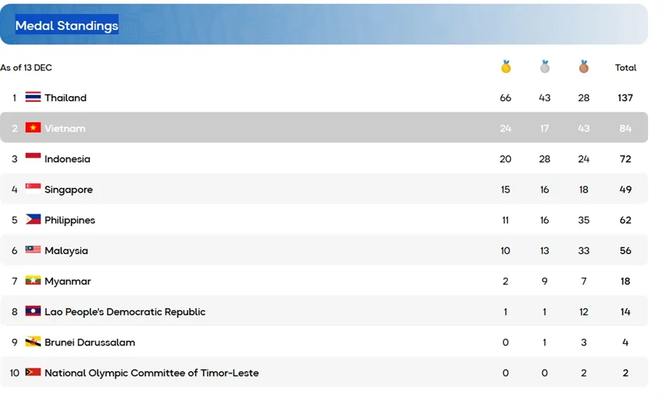 Tính đến hết ngày 12-12, các vận động viên của Thể thao Việt Nam đã mang về 24 huy chương vàng, tạo nền tảng quan trọng để đoàn tiếp tục bứt phá trên bảng tổng sắp huy chương. Với lịch thi đấu dày đặc và nhiều nội dung thế mạnh được triển khai trong ngày mới, đoàn Việt Nam được kỳ vọng sẽ có thêm một ngày thi đấu thành công và rực rỡ.