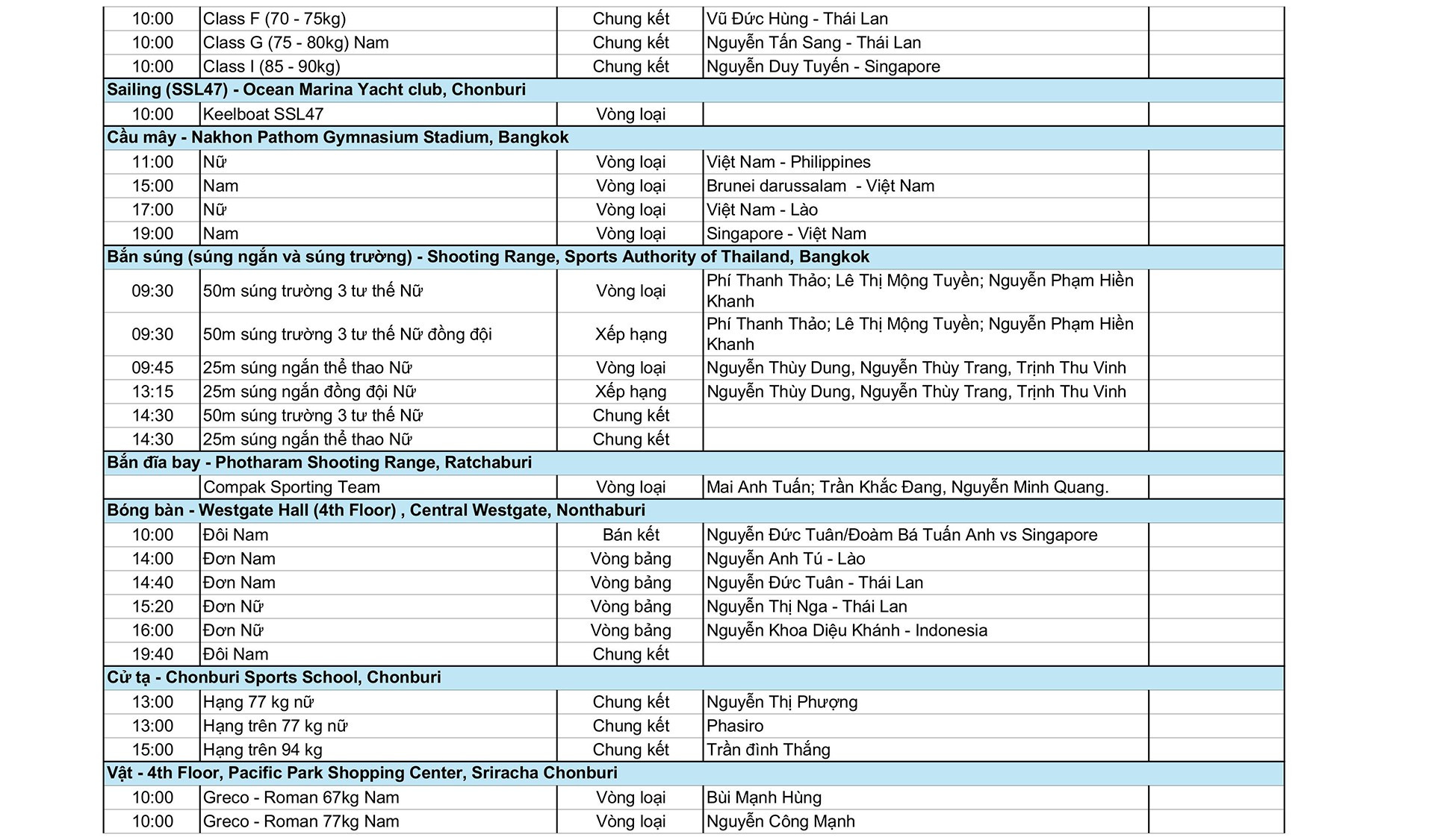 Võ thuật cũng được xem là điểm nhấn của ngày thi đấu khi Muay và pencak silat có nhiều vận động viên Việt Nam góp mặt ở các trận chung kết. Dù phải đối mặt với sự cạnh tranh quyết liệt từ các đối thủ mạnh trong khu vực, cơ hội giành thêm huy chương vàng vẫn rộng mở.