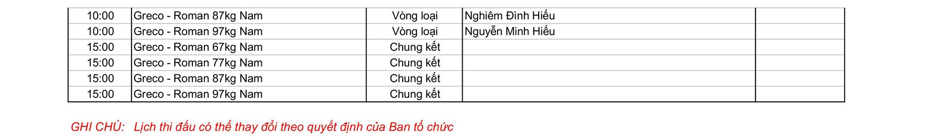 Cùng ngày, các nội dung đấu vật Greco-Roman diễn ra trọn vẹn ở tất cả các hạng cân. Mật độ thi đấu dày đặt ra thách thức không nhỏ, song nếu vượt qua vòng loại thuận lợi, các đô vật Việt Nam hoàn toàn có khả năng tranh chấp huy chương, nhất là ở những hạng cân trung bình.