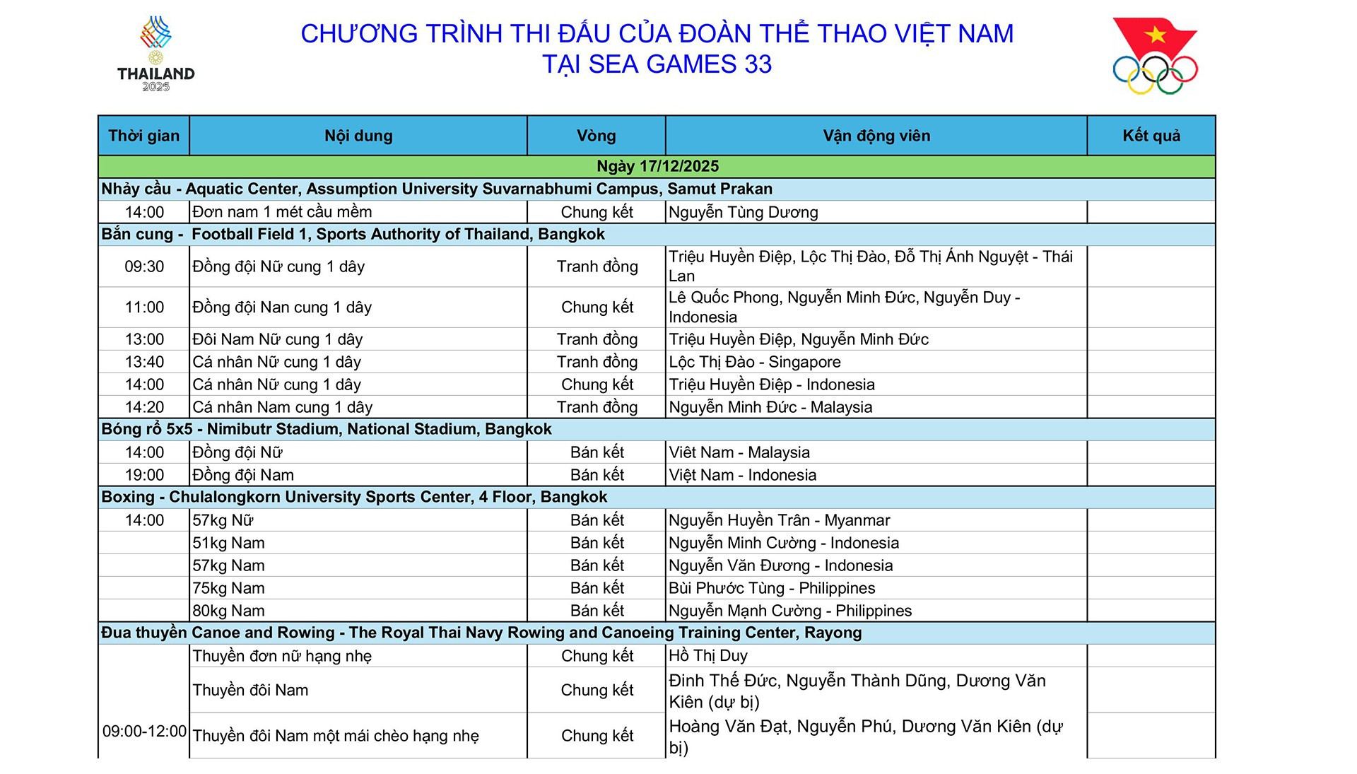Bên cạnh đó, bắn cung tiếp tục được kỳ vọng mang về những kết quả tích cực. Cờ vua và bóng bàn bước vào các vòng đấu quan trọng, hứa hẹn đem đến thêm niềm vui cho Đoàn Thể thao Việt Nam nếu tạo được bất ngờ.
