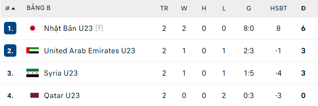 Ở bảng B, U23 Nhật Bản đã nắm chắc ngôi đầu, trong khi tấm vé nhì bảng là cuộc cạnh tranh trực tiếp giữa U23 Các Tiểu vương quốc Ả Rập Thống nhất (UAE) và U23 Syria.