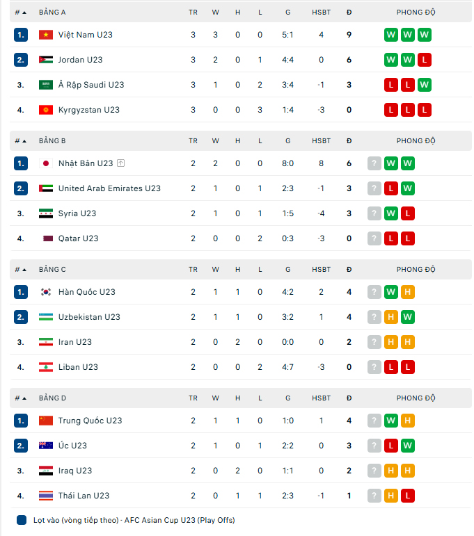 Bảng xếp hạng U23 Việt Nam vòng bảng
