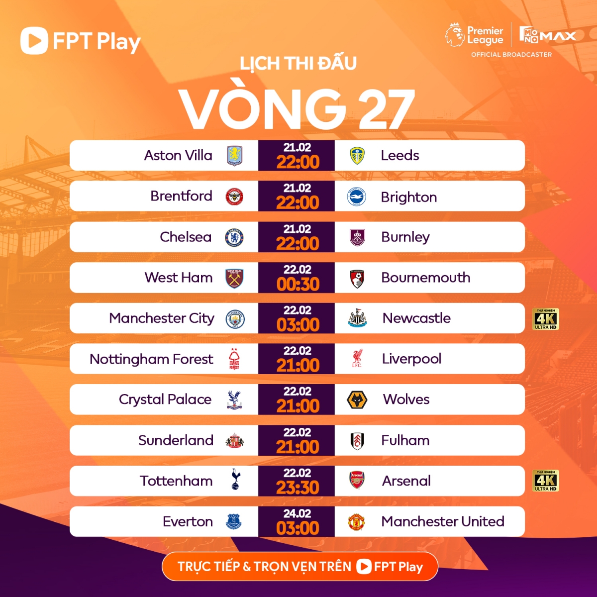 Lịch thi đấu và trực tiếp bóng đá hôm nay 21/2 rạng sáng 22/2