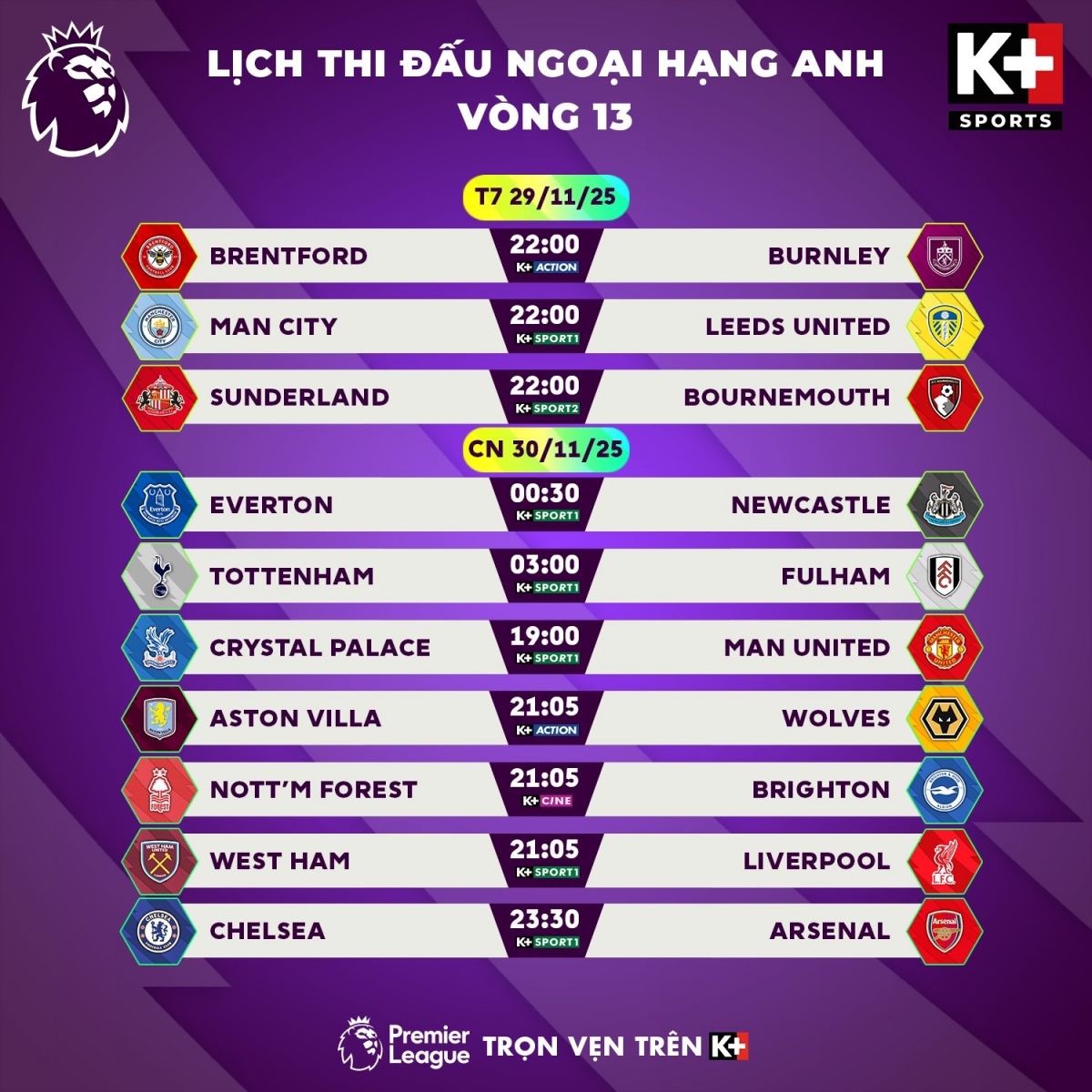 Hôm nay sẽ diễn ra các trận đấu sớm của vòng 13 Ngoại hạng Anh 2025/2026.