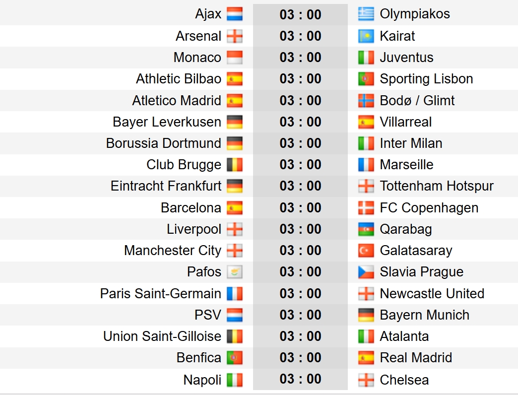 Một số trận đấu đáng chú ý khác gồm: Monaco vs Juventus, Arsenal gặp Kairat, Dortmund vs Inter Milan, Barca đấu Copenhagen, Liverpool gặp Qarabag, Man City chạm trán Galatasaray hay Benfica đối đầu Real Madrid.