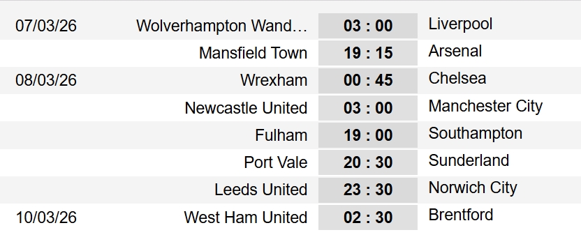 Các cặp đấu còn lại của vòng 5 FA Cup là Fulham vs Southampton, Port Vale đấu Sunderland, Leeds United chạm trán Norwich City và West Ham trên sân nhà tiếp Brentford.