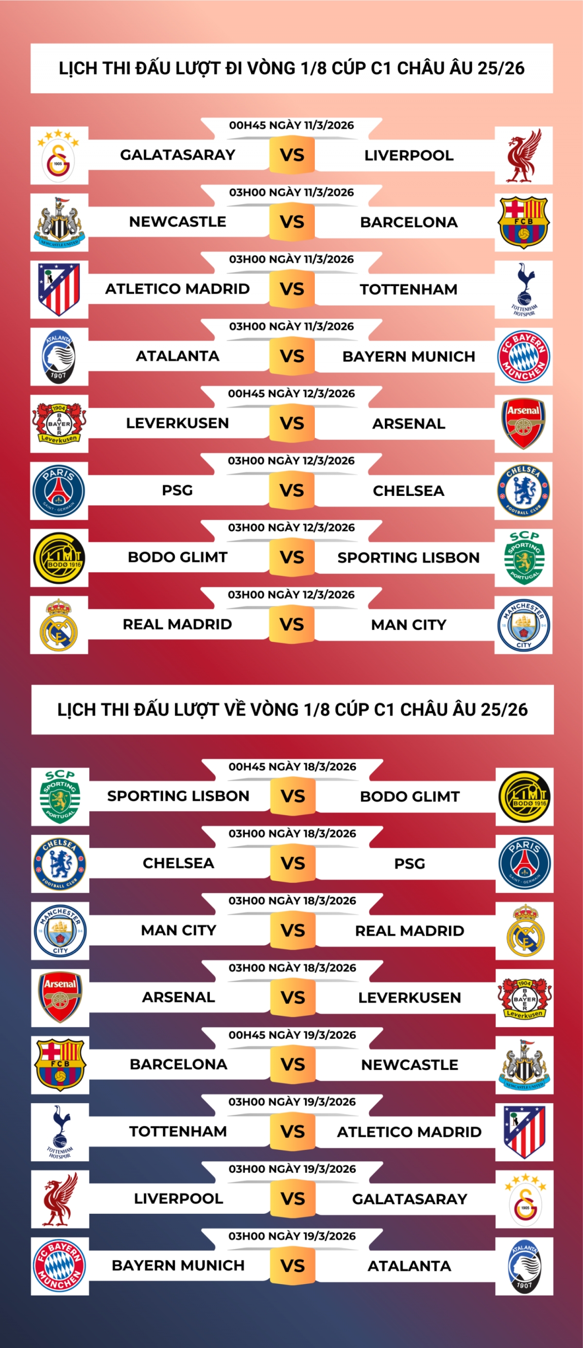 Lịch thi đấu và trực tiếp vòng 1/8 Cúp C1 châu Âu 2025/2026