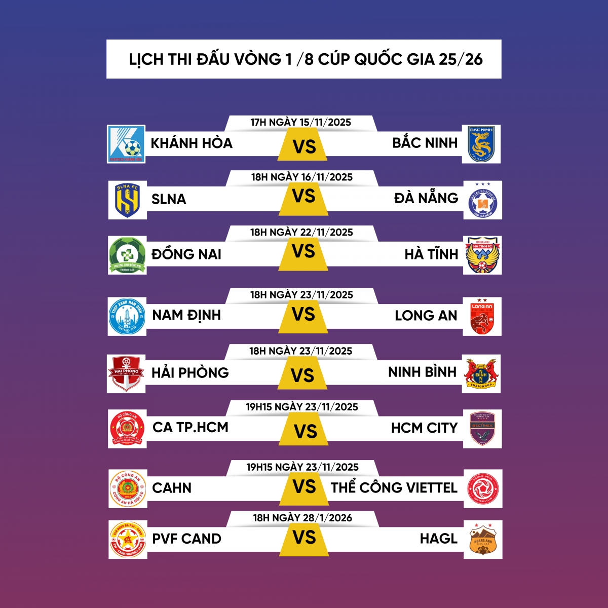 Lịch thi đấu vòng 1/8 Cúp Quốc gia 2025/2026.