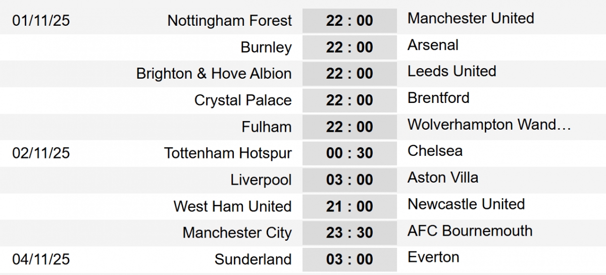 Lịch thi đấu vòng 10 Ngoại hạng Anh 2025/2026, các trận đấu sẽ diễn ra từ 1 đến 4/11 theo giờ Việt Nam. Ở vòng đấu này, MU có thời cơ lớn để bứt phá lên nhóm đầu trên bảng xếp hạng khi chỉ phải gặp đội bóng đang khủng hoảng là Nottingham Forest.