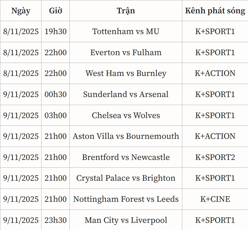 Trận đấu sớm nhất vòng này diễn ra lúc 19h30 ngày 8/11 khi Tottenham tiếp đón MU trên sân nhà. Dưới thời HLV Thomas Frank, Tottenham đang hồi sinh mạnh mẽ với chuỗi 5 trận bất bại, lối chơi pressing và kiểm soát bóng chủ động. Ngược lại, MU của Ruben Amorim vẫn chưa thật sự ổn định, đặc biệt khi phải đá sân khách. Việc đối đầu với đối thủ có phong độ cao sẽ là bài test thực sự cho tham vọng trở lại top 4 của "Quỷ đỏ".