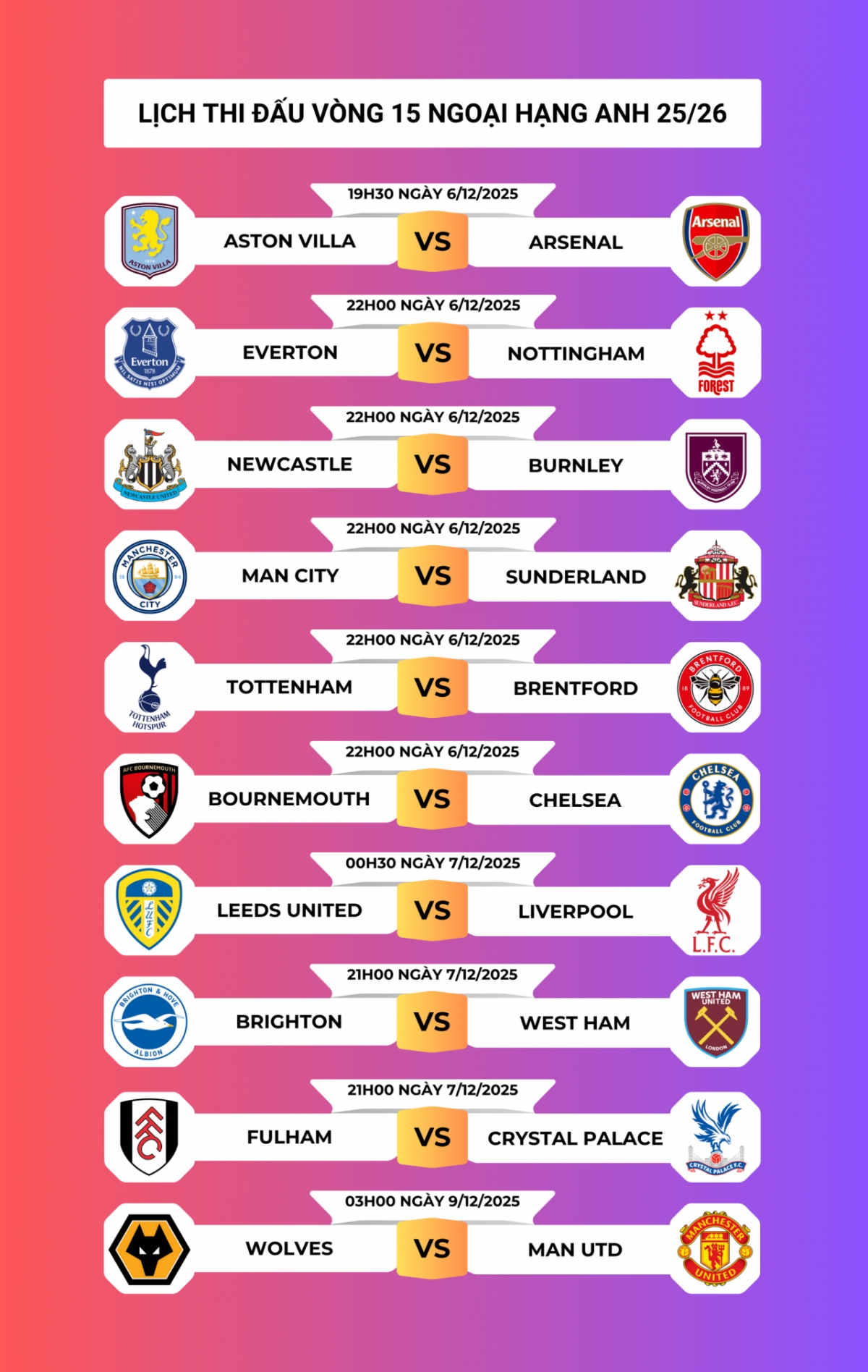 Bên cạnh trận cặp đấu giữa Wolves vs MU, vòng 15 Ngoại hạng Anh 2025/2026 còn có một số trận đấu đáng chú ý khác như Aston Villa vs Arsenal, Man City vs Sunderland, Bournemouth vs Chelsea hay Leeds United vs Liverpool.