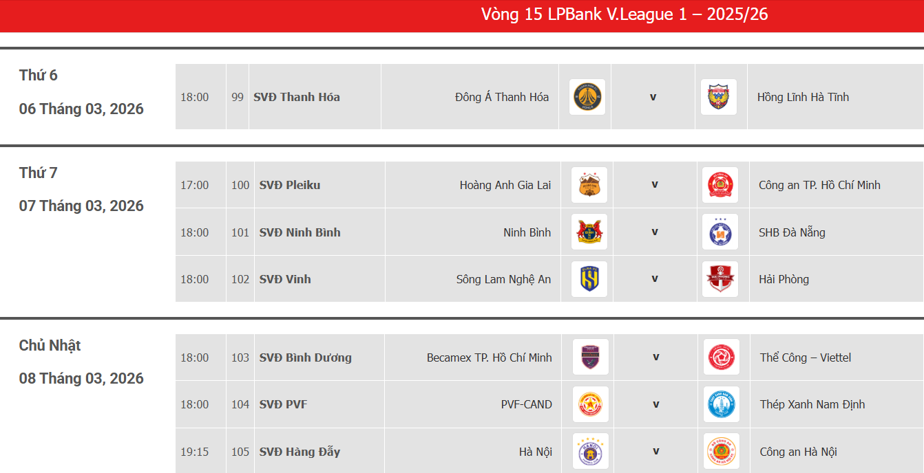 Theo lịch thi đấu vòng 15 V-League 2025-2026 còn có các cặp đấu hấp dẫn khác: Đông Á Thanh Hóa-Hồng Lĩnh Hà Tĩnh, Hoàng Anh Gia Lai-Công an TP Hồ Chí Minh, Sông Lam Nghệ An-Hải Phòng FC, Becamex TP Hồ Chí Minh gặp Thể Công-Viettel…