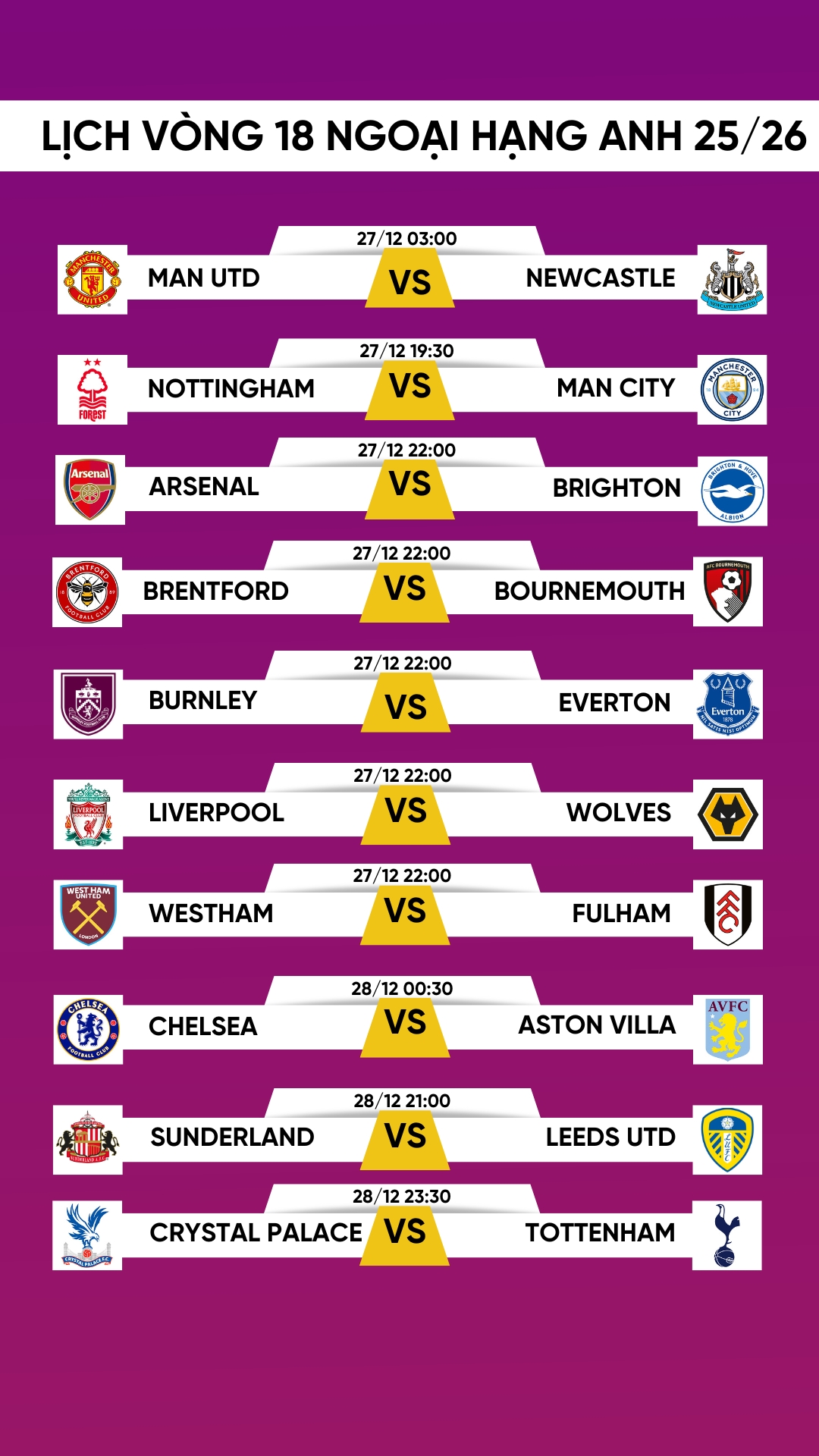 Lịch thi đấu vòng 18 Ngoại hạng Anh 2025/2026.