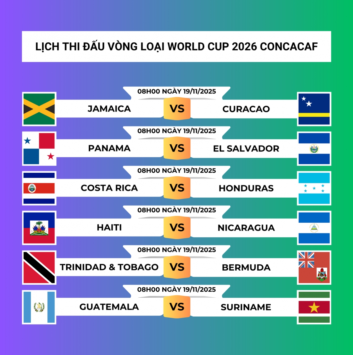 Lịch thi đấu bóng đá vòng loại World Cup 2026 khu vực Bắc, Trung Mỹ và Caribe (CONCACAF), ban tổ chức sẽ xác định được 3 đội tuyển giành vé đến với vòng chung kết sau lượt trận cuối cùng diễn ra vào sáng 19/11.