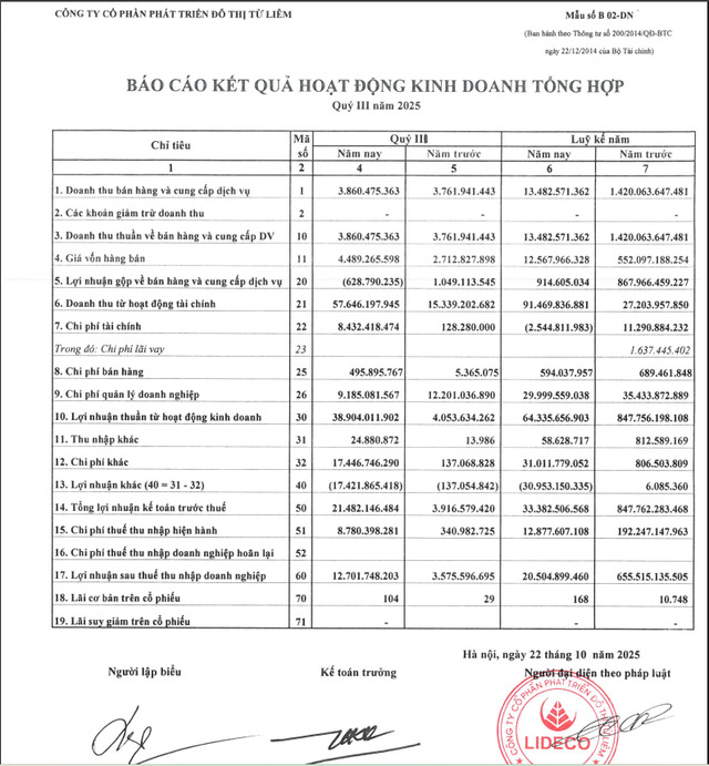 Cụ thể, theo Báo cáo tài chính quý III/2025 của NTL cho thấy,trong kỳ, doanh nghiệp ghi nhận doanh thu thuần đạt 3,8 tỷ đồng, tăng khoảng 3%so với cùng kỳ năm ngoái, toàn bộ đến từ cung cấp dịch vụ, công ty “trắng”doanh thu mảng kinh doanh bất động sản.