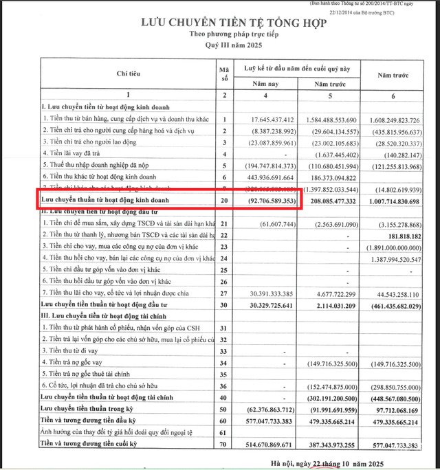 Báo cáo lưu chuyển tiền tệ cũng cho thấy dòng tiền kinhdoanh tính đến cuối quý III là âm gần 93 tỷ đồng, trong khi cùng kỳ năm trướcdương 208 tỷ đồng. Nguyên nhân được đưa ra là do NTL chi lớn cho các hoạt độngkinh doanh và thuế thu nhập doanh nghiệp.