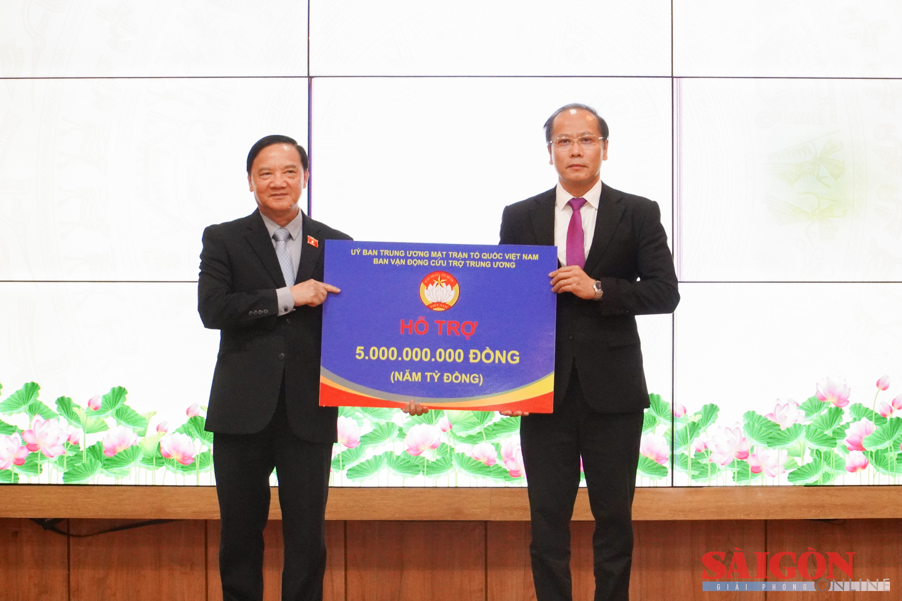 Lãnh đạo tỉnh Khánh Hòa tiếp nhận 5 tỷ đồng do Ủy ban Trung ương MTTQ Việt Nam, Ban Vận động cứu trợ Trung ương hỗ trợ khắc phục thiệt hại do mưa lũ gây ra. Ảnh: HIẾU GIANG
