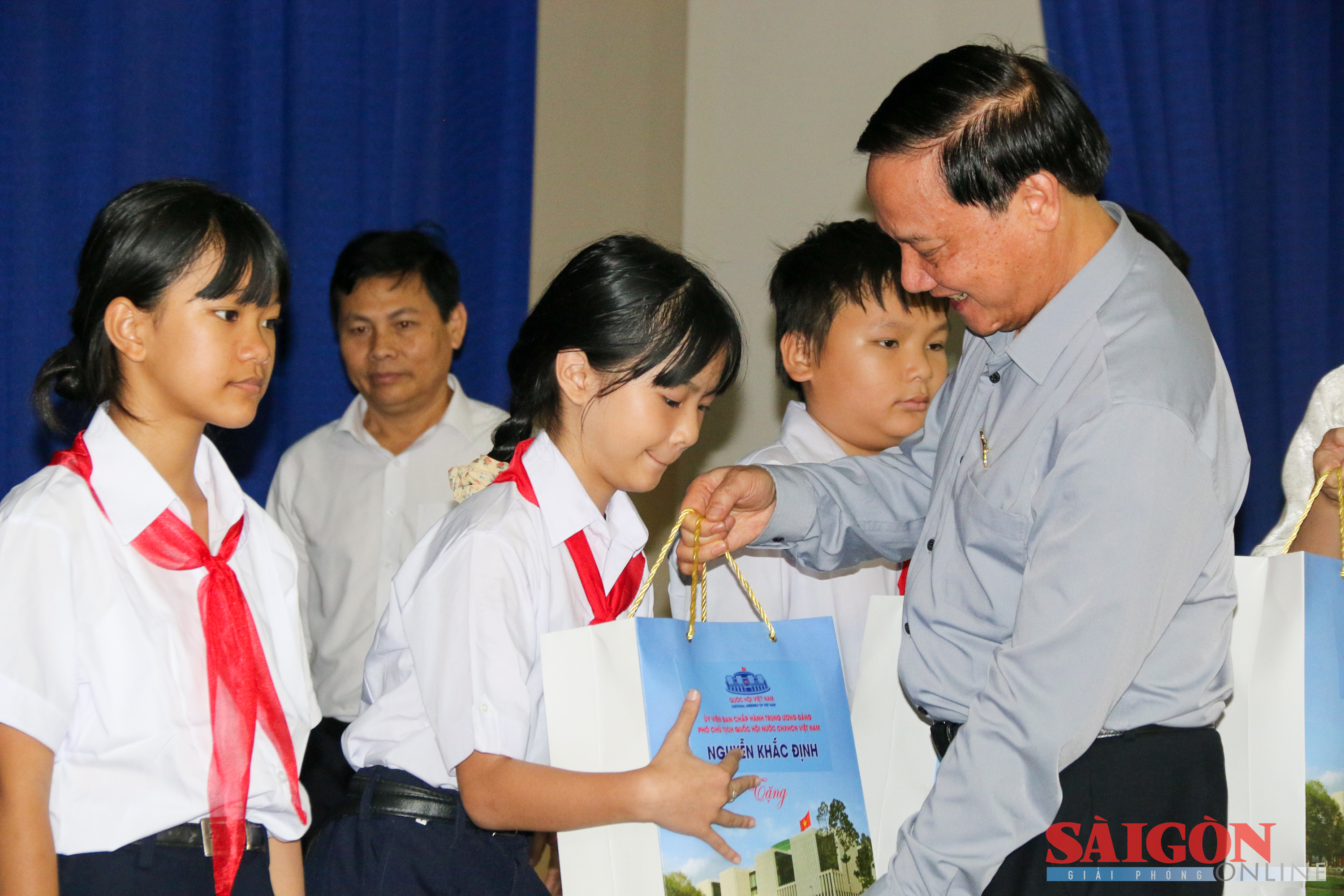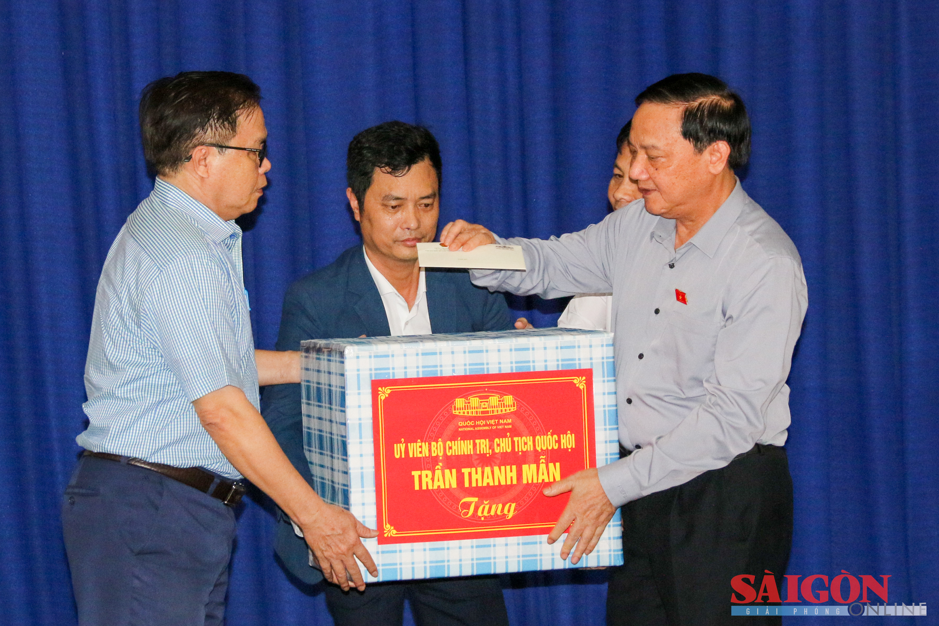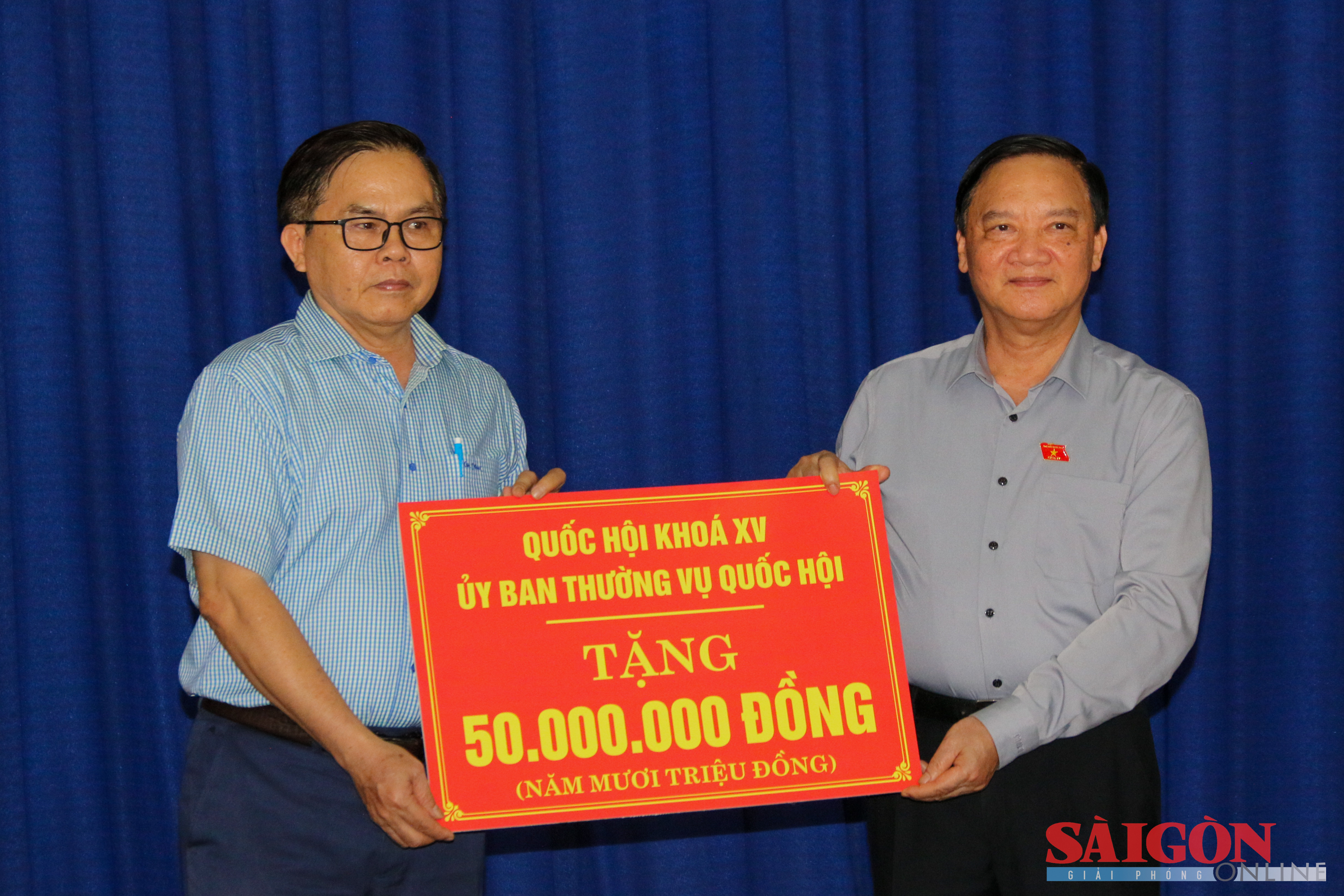 Thay mặt Chủ tịch Quốc hội Trần Thanh Mẫn, đồng chí Nguyễn Khắc Định trao tặng hỗ trợ Trường THCS Lương Định Của. Ảnh: HIẾU GIANG
