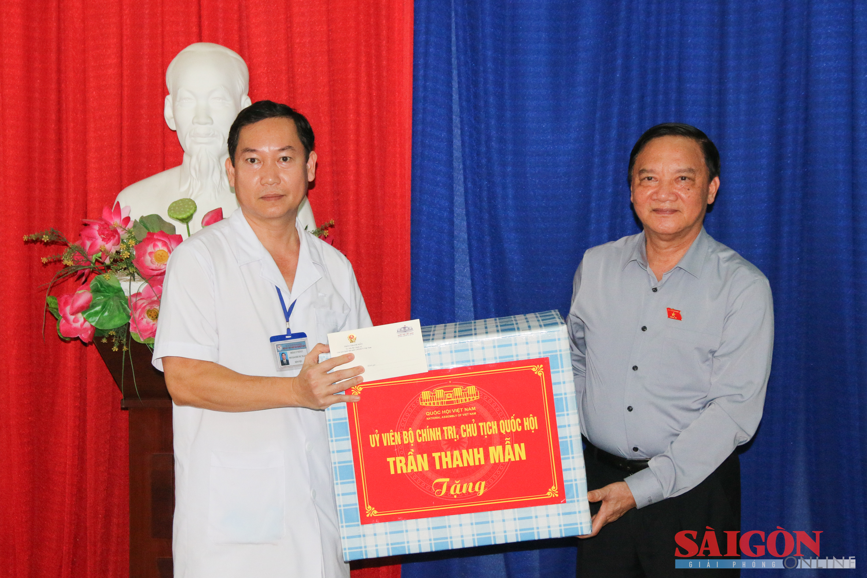 Thay mặt Chủ tịch Quốc hội Trần Thanh Mẫn, đồng chí Nguyễn Khắc Định trao tặng hỗ trợ Bệnh viện Bệnh Nhiệt đới Khánh Hòa. Ảnh: HIẾU GIANG