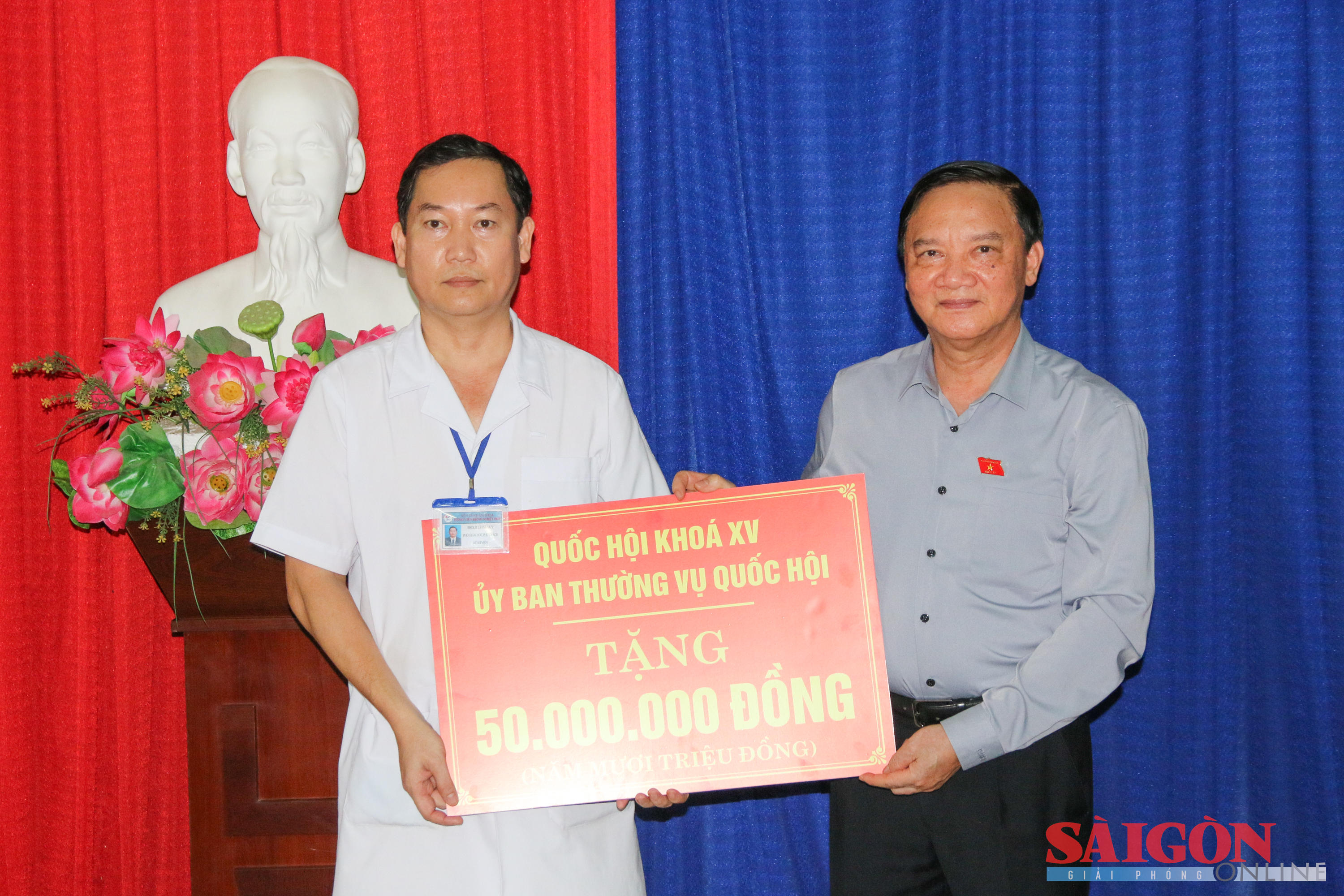 Đồng chí Nguyễn Khắc Định trao quà của Ủy ban Thường vụ Quốc hội gửi tặng Bệnh viện Bệnh Nhiệt đới Khánh Hòa. Ảnh: HIẾU GIANG