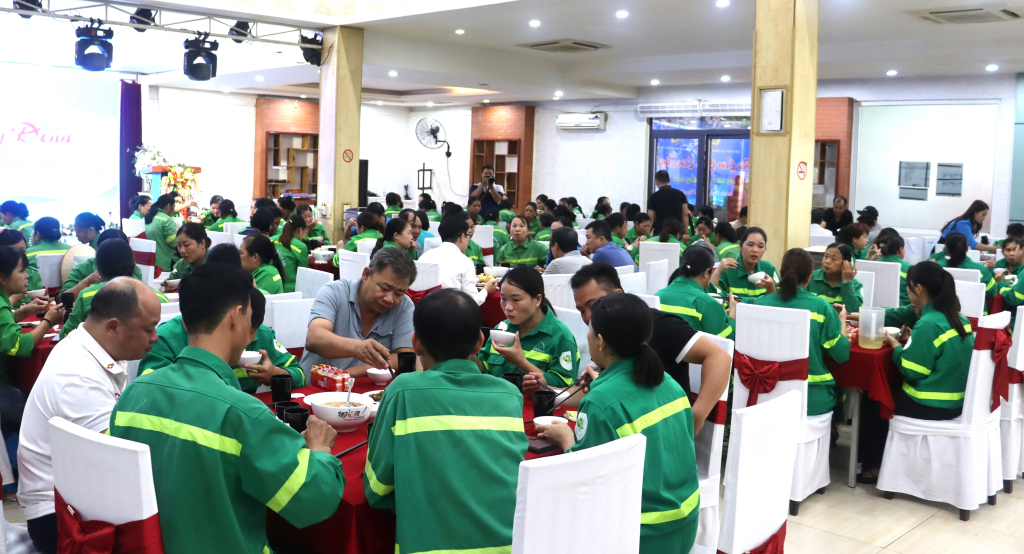 “Bữa cơm Công đoàn” được chuẩn bị với 180 suất cơm (trị giá 70.000 đồng/suất), bảo đảm đủ dinh dưỡng, an toàn vệ sinh, thể hiện tinh thần đoàn kết, trách nhiệm xã hội của tổ chức Công đoàn trong việc đồng hành cùng doanh nghiệp, chăm lo thiết thực cho công nhân lao động, đặc biệt là những người đang trực tiếp làm việc ở tuyến đầu giữ gìn môi trường trong điều kiện mưa gió, môi trường ẩm ướt, độc hại để đảm bảo đời sống dân sinh sau bão.