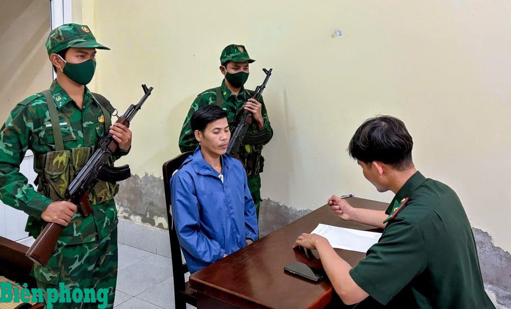 Tổ công tác Đồn Biên phòng An Thạnh Ba lấy lời khai đối tượng Lê Văn Đã. Ảnh: Văn Long