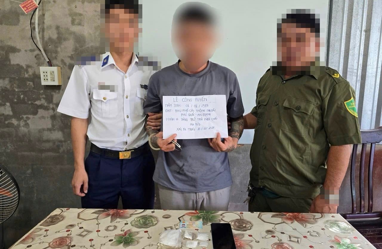 Cụ thể, vào lúc 17 giờ 20 phút ngày 15/12, tại khu vực bãi biển Nhà hàng hải sản Dương Tơ, thuộc Tổ 1, Khu phố Dương Tơ, đặc khu Phú Quốc, tỉnh An Giang, Tổ Công tác của Bộ Tư lệnh Vùng Cảnh sát biển 4 đã tiến hành bắt quả tang đối tượng Lê Công Tuyền (SN 1989, trú tại Khu phố Cây Thông Ngoài, đặc khu Phú Quốc, tỉnh An Giang) chỗ ở hiện tại Tổ 1, Khu phố Dương Tơ, đặc khu Phú Quốc, tỉnh An Giang) có hành vi tàng trữ trái phép chất ma túy.