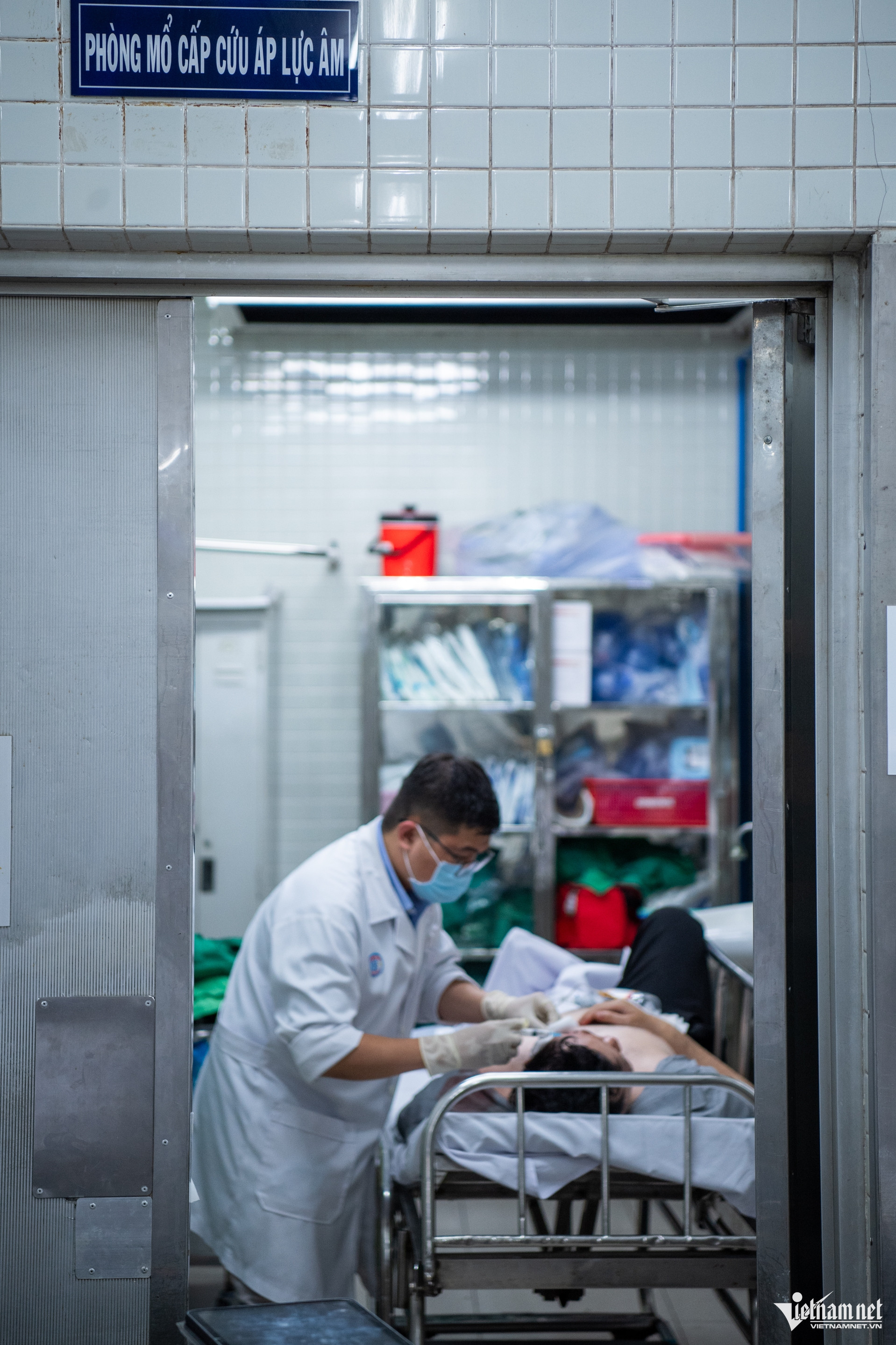 Càng về khuya, số ca cấp cứu tăng dần. Một người đàn ông bị tai nạn giao thông vào chiều mùng 3 Tết, chuyển đến Bệnh viện Chợ Rẫy và ngay lập tức được đưa vào phòng mổ cấp cứu áp lực âm để xử lý các chấn thương.