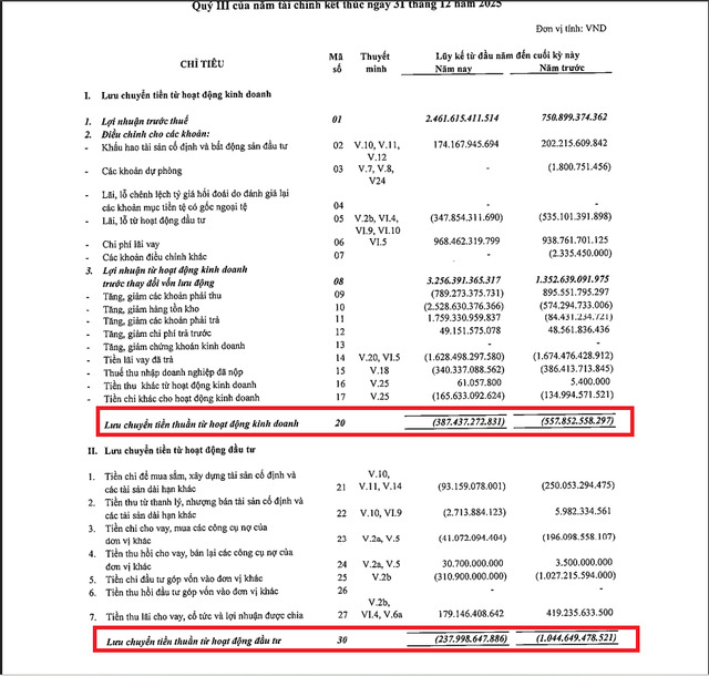 Dòng tiền của BCM liên tục âm (Nguồn: BCTC Hợp nhất quý III/2025 của BCM).