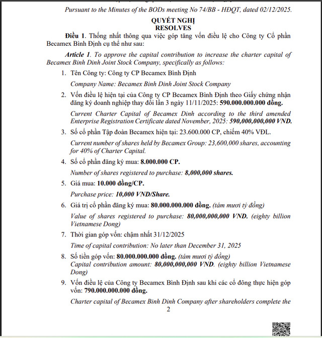 Vốn điều lệ của Becamex Bình Định sau khi các cổ đông thựchiện góp vốn là 790 tỷ đồng. Số lượng cổ phần Becamex Group sở hữu tại BecamexBình Định sau khi thực hiện góp vốn là 31,6 triệu cổ phần; tương ứng 40% vốn điêùlệ.