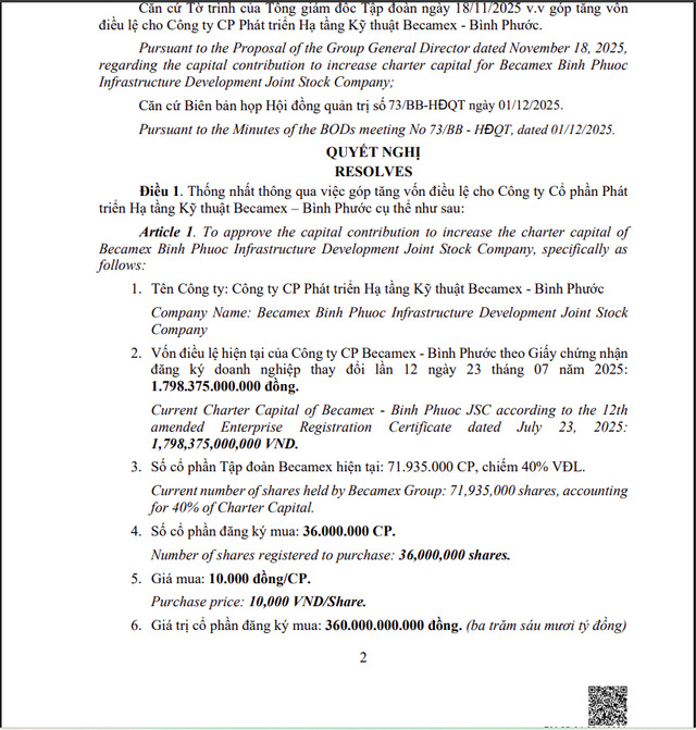 Mới đây, HĐQT Becamex Group đã có Nghị quyết số 73/NQ-HĐQTngày 1/12/2025 về việc góp tăng vốn điều lệ Công ty CP Phát triển Hạ tầng Kỹthuật Becamex – Bình Phước (Becamex Bình Phước).