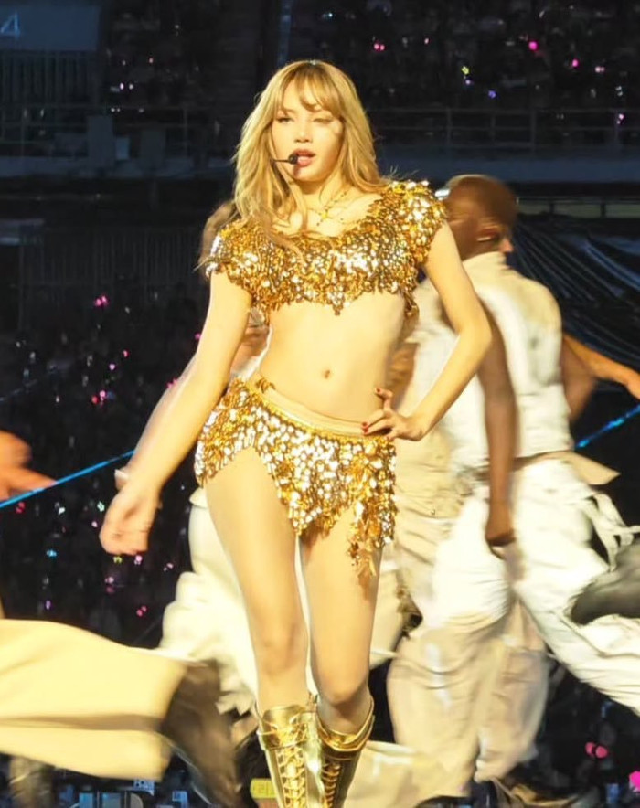 Đêm 1, Lisa xuất hiện trong trang phục ánh vàng được tạo thành từ những mảnh tròn kim loại ghép lại như áo giáp chiến binh. (Ảnh: X)