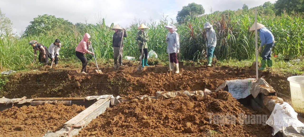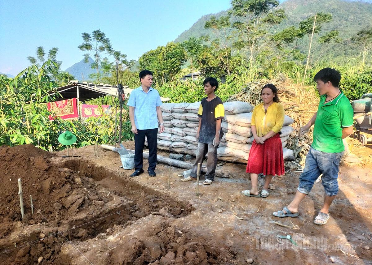 Lãnh đạo xã Linh Hồ xuống kiểm tra, đôn đốc tiến độ thi công, động viên các hộ gia đình.