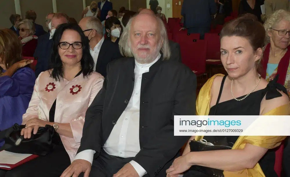 Từ trái qua: Quốc vụ khanh Áo Andrea Mayer, nhà văn Hungary László Krasznahorkai và người vợ thứ hai của ông - chuyên gia thiết kế đồ họa, nhà Hán học Dorka Krasznahorkai tại lễ nhận Giải thưởng Nhà nước Áo về Văn học châu Âu 2021. Ảnh: Imago Images