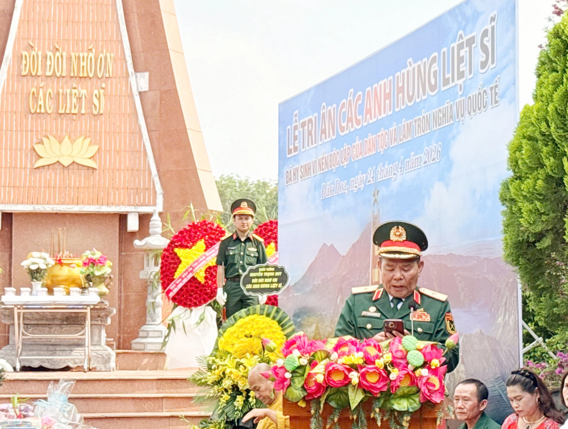 Phát biểu tại buổi lễ, Đại tá Đoàn Tiến Dũng - Phó Chủ tịch Thường trực Hội Hữu nghị Việt Nam - Campuchia tỉnh Khánh Hòa, Trưởng Ban liên lạc CCB quân tình nguyện Việt Nam tại chiến trường K, Trưởng ban tổ chức đã không giấu được sự xúc động, nhấn mạnh: “Hôm nay, trong không khí trang nghiêm, chúng ta tổ chức lễ tri ân để bày tỏ lòng biết ơn sâu sắc, khắc ghi công lao to lớn của các anh hùng liệt sĩ là đồng đội của chúng ta; đồng thời nhắc nhở thế hệ hôm nay về giá trị của hòa bình, độc lập và trách nhiệm tiếp nối truyền thống yêu nước của các thế hệ đi trước”.