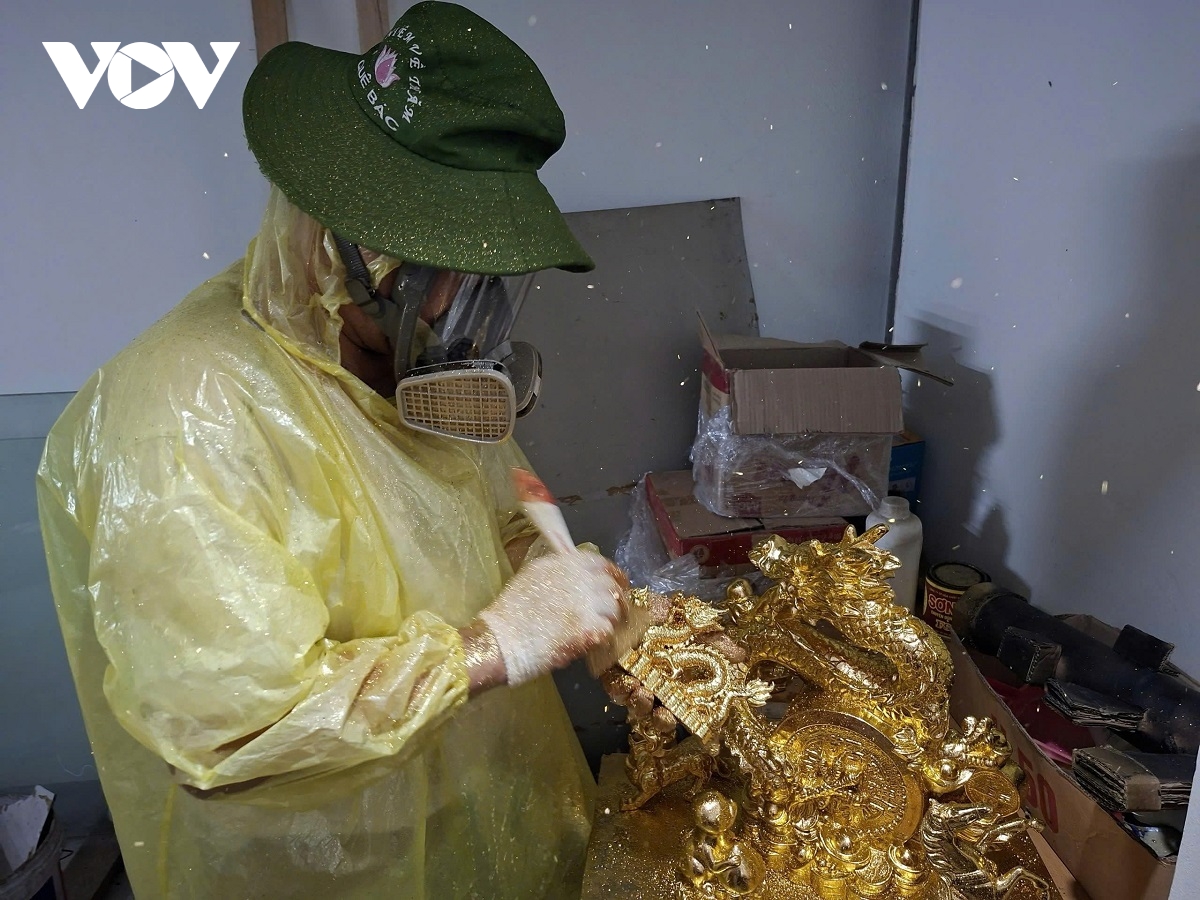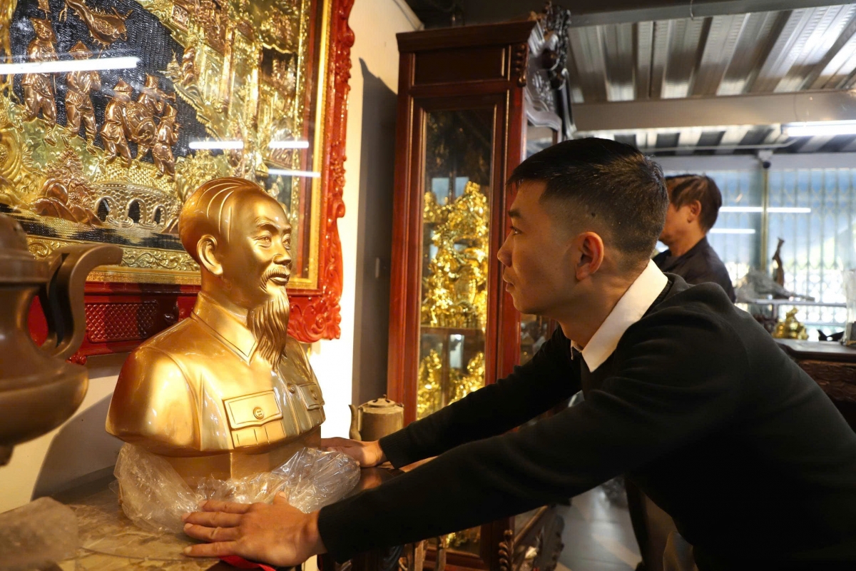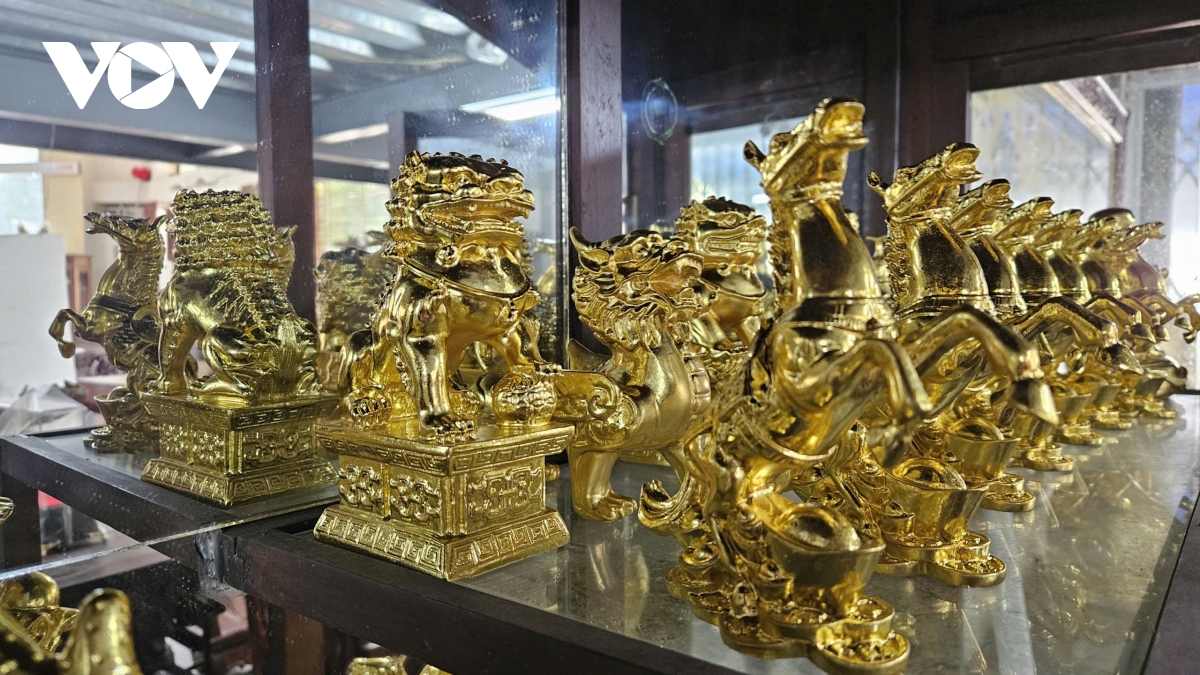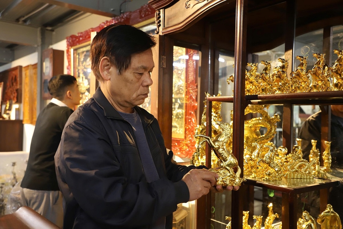 Những ngày cận kề mùa mua sắm cuối năm, dạo một vòng qua các tuyến phố chuyên doanh đồ đồng, đồ phong thủy tại Ninh Bình không khó để bắt gặp ánh vàng lấp lánh từ những gian hàng bày kín linh vật, tượng trang trí và vật phẩm phong thủy dát vàng. Từ rồng, hổ, ngựa… linh vật theo năm cho đến các biểu trưng tài lộc, bình an, tất cả được chế tác tinh xảo, phủ lớp vàng óng ánh, thu hút ánh nhìn ngay từ bên ngoài cửa tiệm.